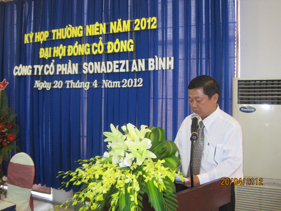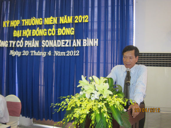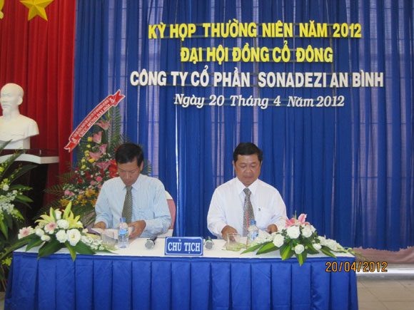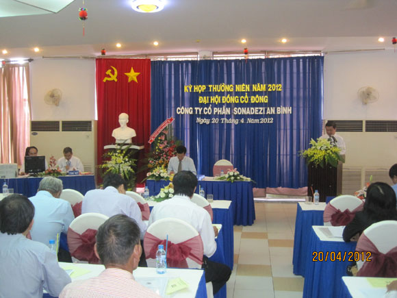 Lúc 8h00 ngày 20 tháng 04 năm 2012, Công ty Cổ phần Sonadezi An Bình đã tổ chức kỳ họp thường niên năm 2012 Đại hội đồng cổ đông tại Hội trường Nhà hàng Sonadezi Biên Hòa